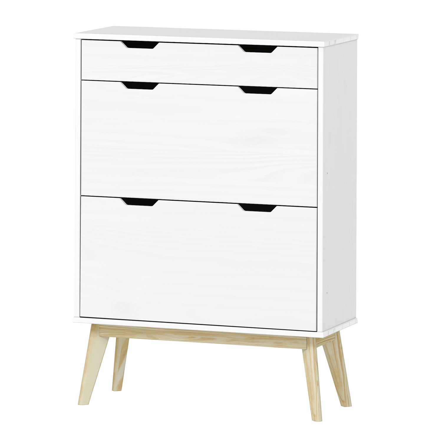 materiál masív borovica, lakované prevedenie 2 zásuvky s kovovými pojazdmi, 1 dvierka, 1 polica otvor na pretiahnutie káblov