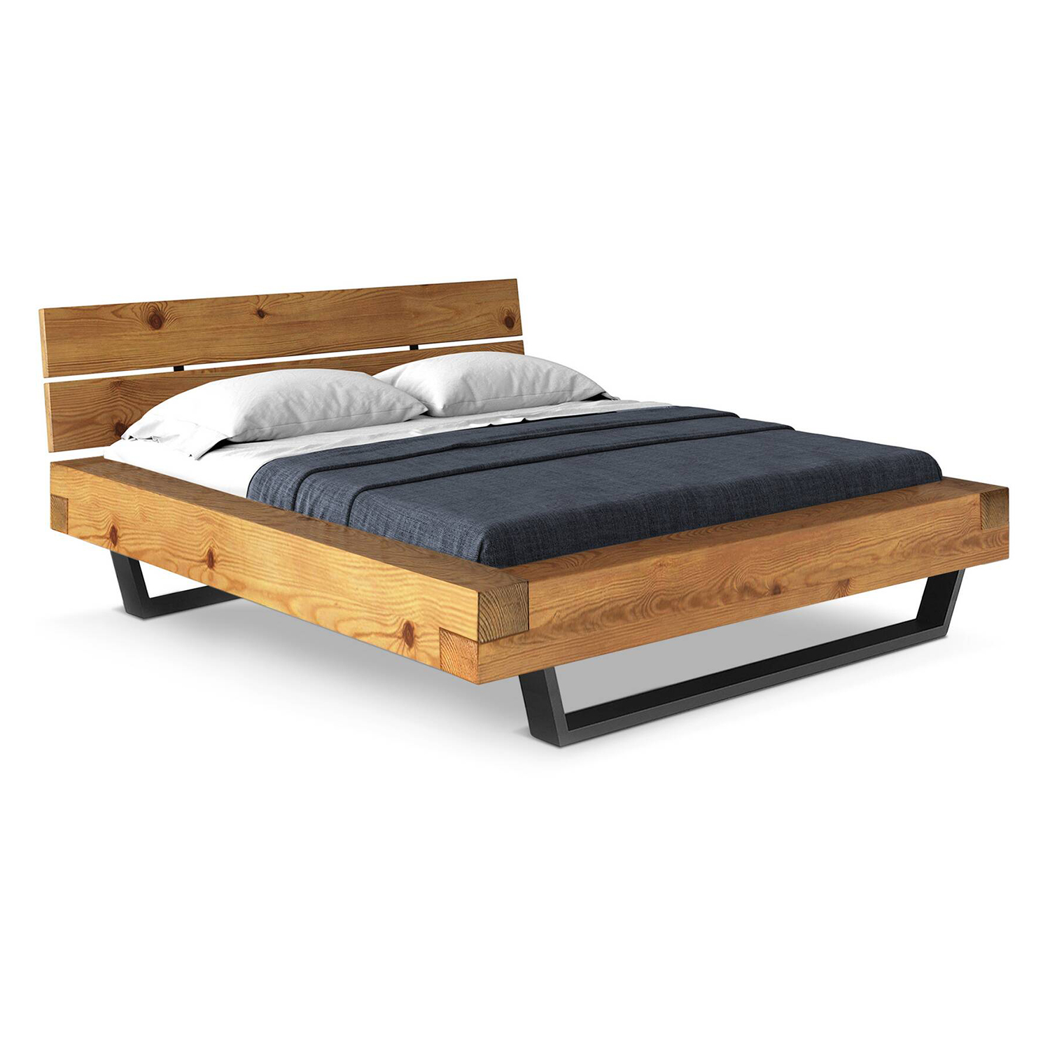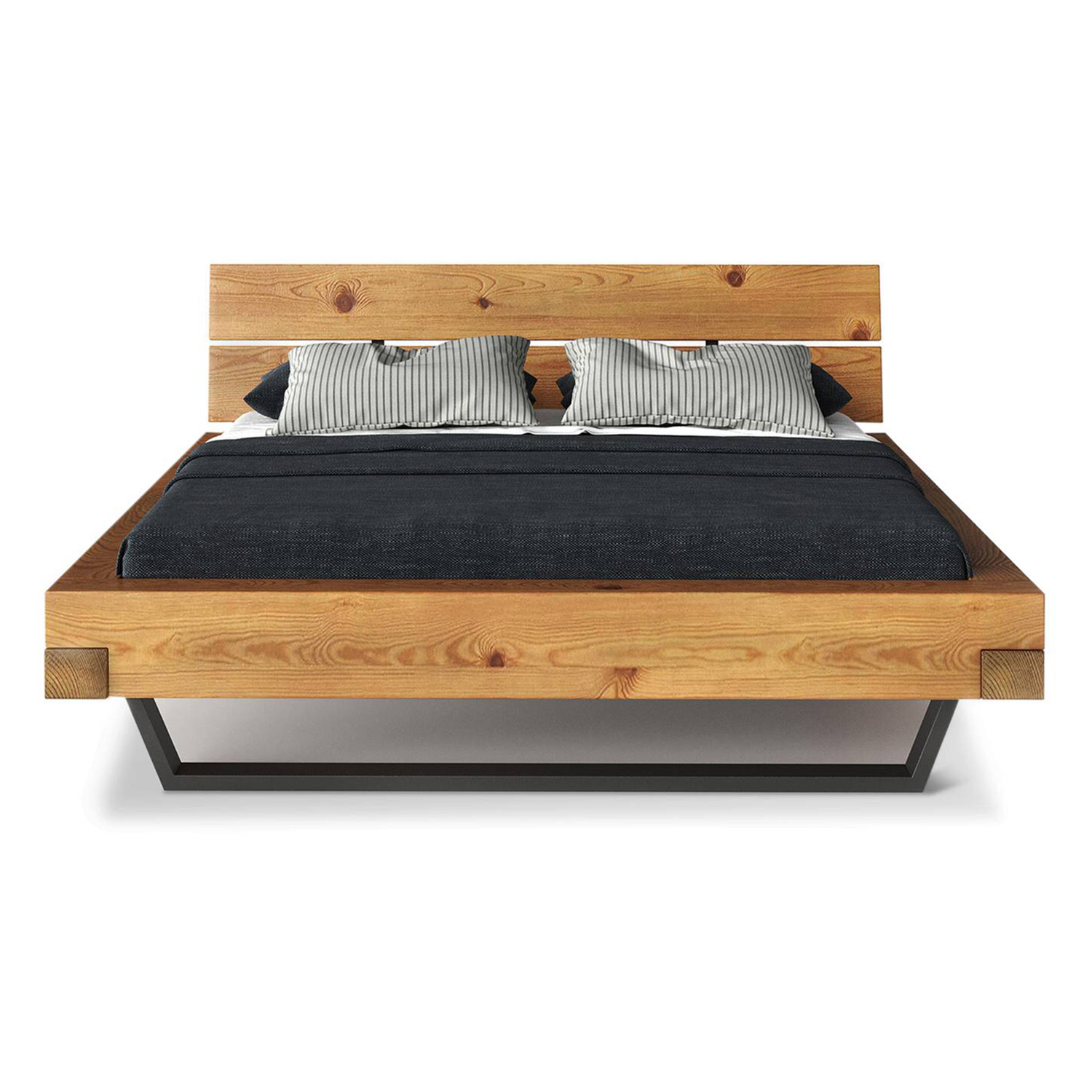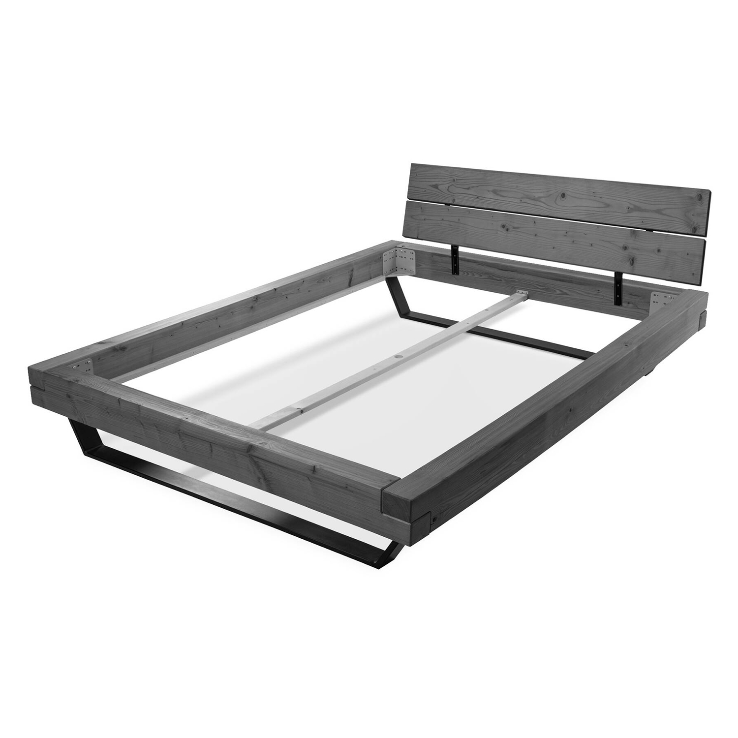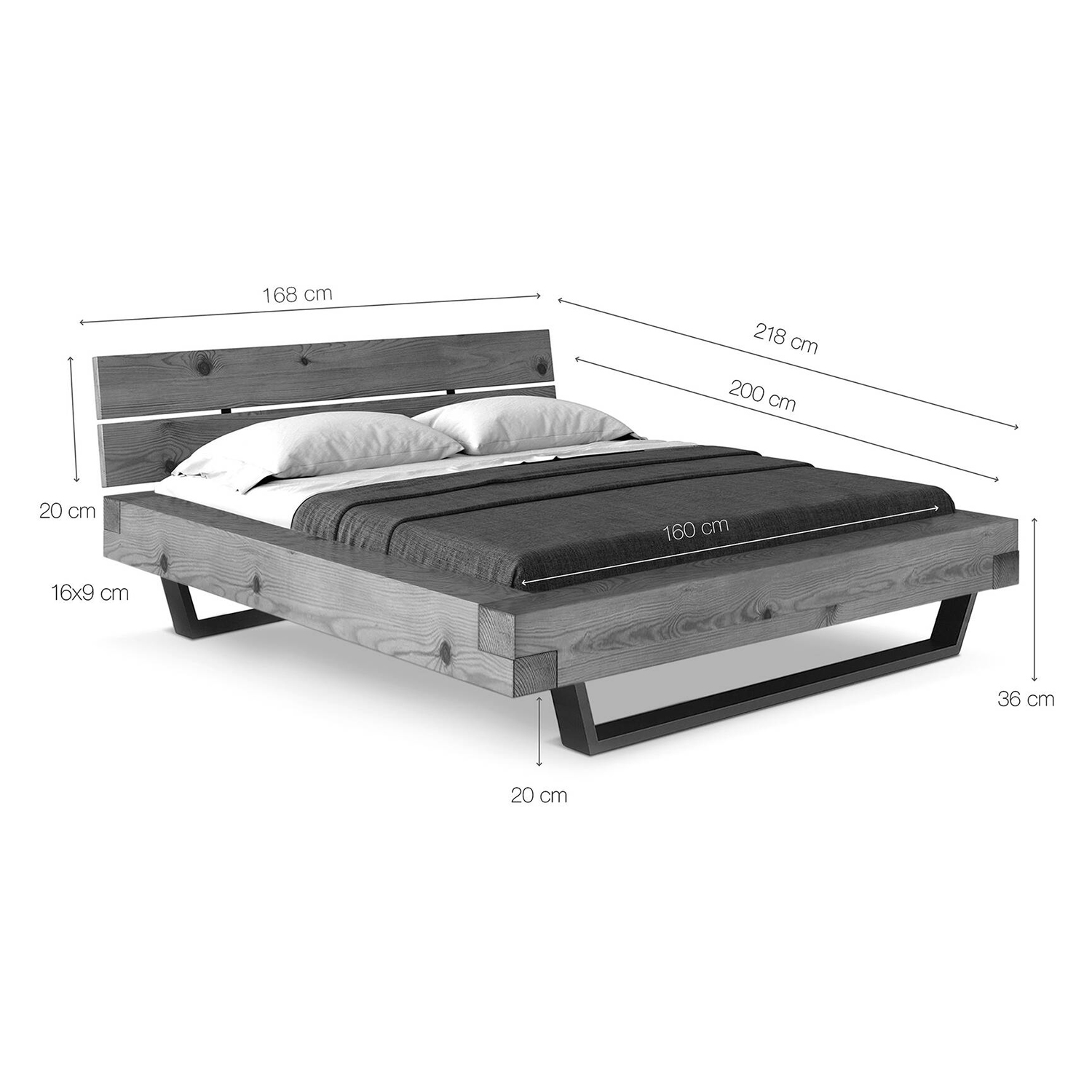 materiál masív smrek, lakované prevedenie vzhľad starého dreva, rustikálny textúrovaný povrch čierne kovové nohy, delené čelo postele cena bez roštu a matraca, výška čela 43 cm minimálna odporúčaná výška matraca 15 cm odporúčaný rozmer matraca 160 × 200 cm alebo 2 kusy 80 × 200 cm a rošt R2 odporúčaná nosnosť do 120 kg na každej polovici postele