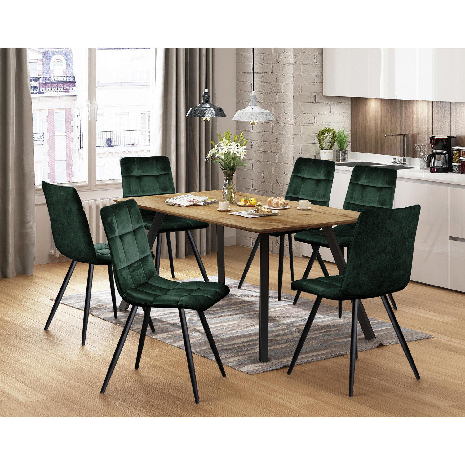jedálenský stôl BERGEN 4090 a 6 jedálenských stoličiek BERGEN 4092 stôl: doska MDF, farebné prevedenie dub Wotan kovová konštrukcia, farebné prevedenie čierna stolička: zamatový poťah, farebné prevedenie zelená kovová konštrukcia, farebné prevedenie čierna výška sedu stoličky 51 cm rozmer stola (š/h/v) 140 × 80 × 75 cm rozmer stoličky (š/h/v) 44 × 54 × 88 cm