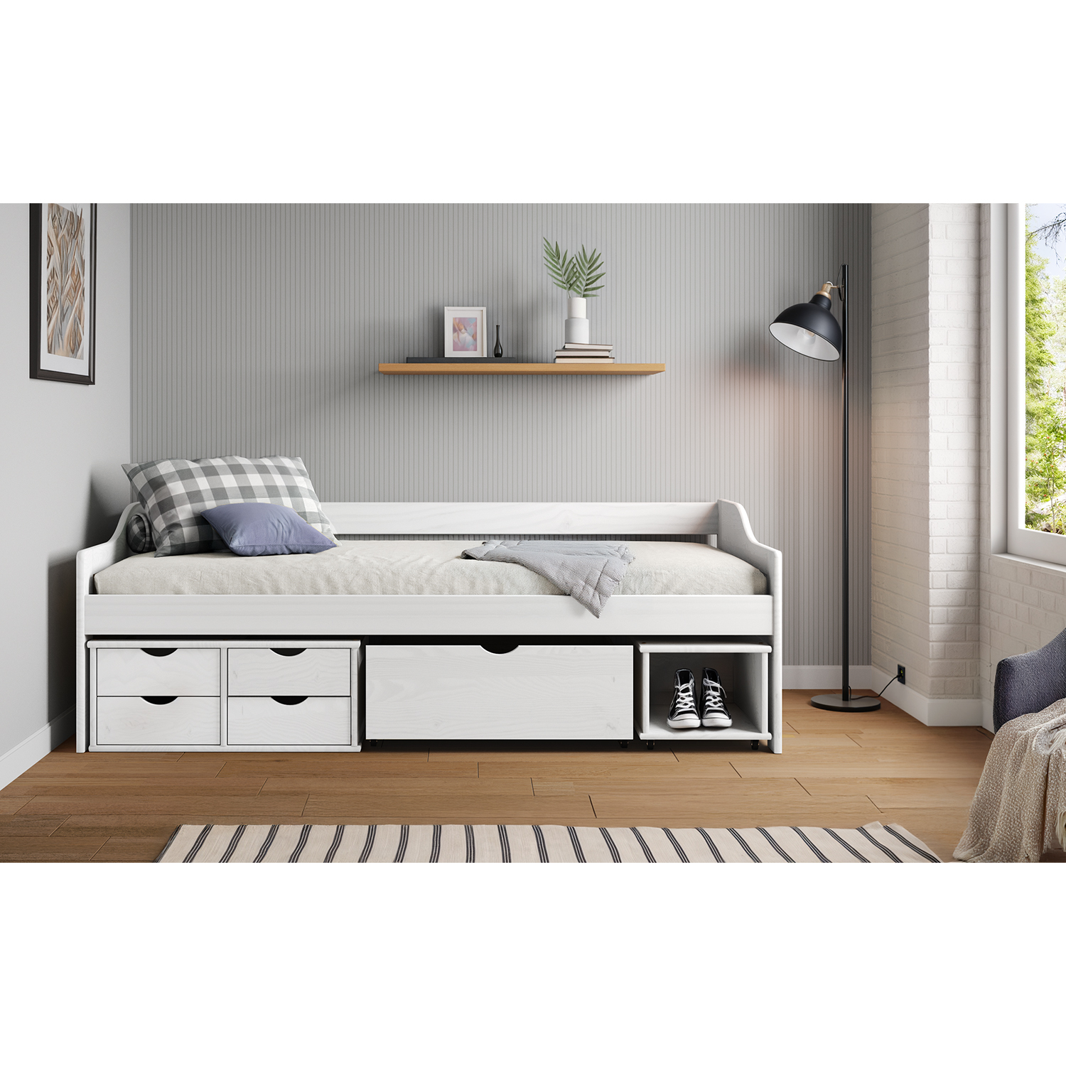 materiál masív borovica, farebné prevedenie biely lak praktické úložné priestory pod posteľou (zásuvky a otvorená polica) v cene výška sedu 50 cm, cena vrátane roštu (drevený latkový), matrac nie je v cene odporúčaný rozmer matraca 90 × 200 cm (M2, M5, M9, M12, M24, M26) ako vhodný doplnok odporúčame čalúnený valec M10 hĺbka širokej zásuvky 65,5 cm, hĺbka malých zásuviek 39 cm, hĺbka otvorenej police 44,5 cm
