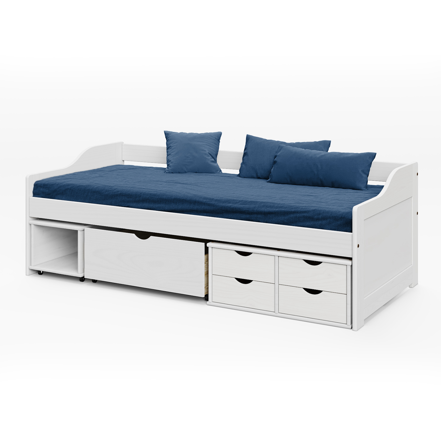 materiál masív borovica, farebné prevedenie biely lak model ULLI, výška sedu 52 cm, praktické úložné priestory pod posteľou (3 zásuvky a výsuv) sú v c...