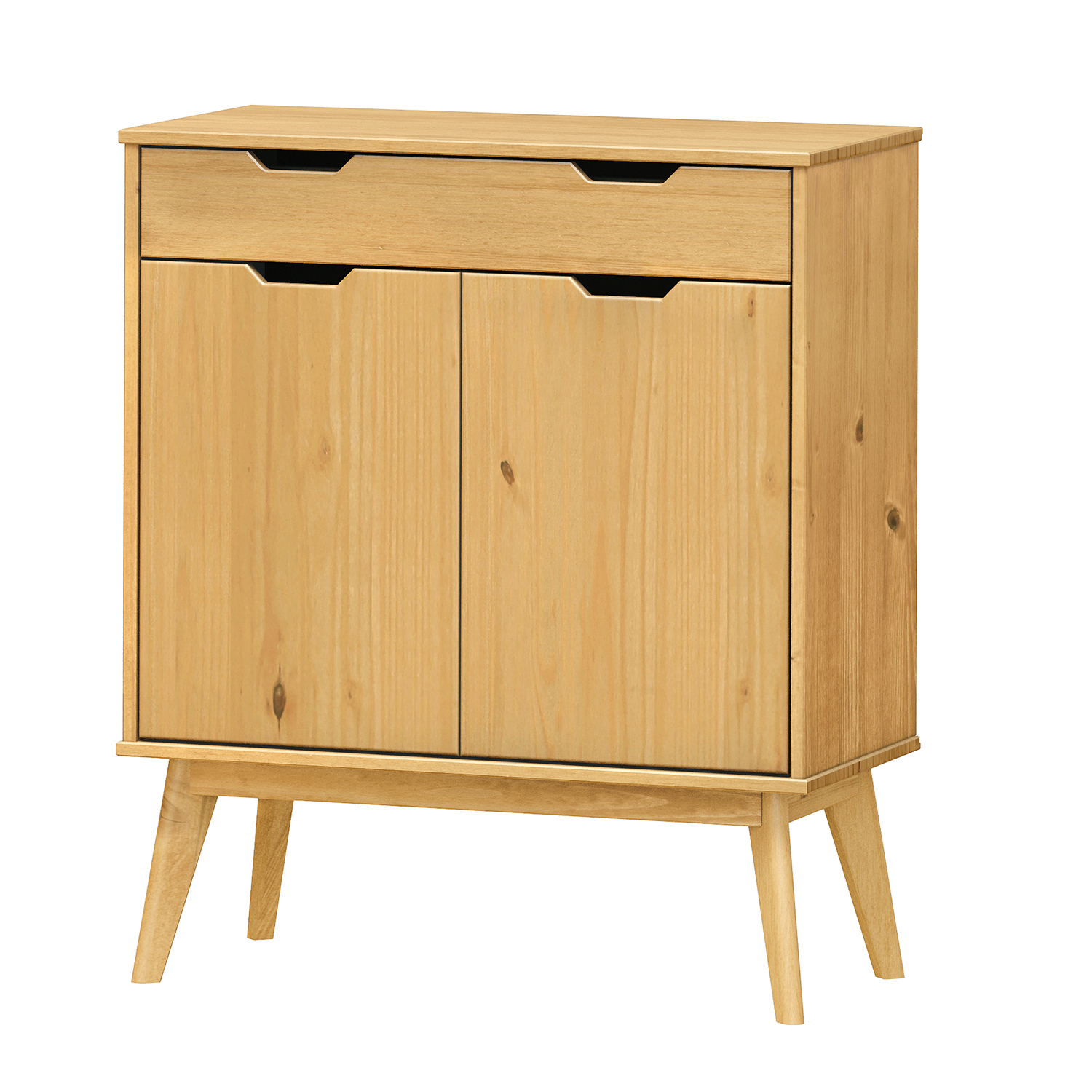 materiál masív borovica, lakované prevedenie 2 zásuvky s kovovými pojazdmi, 1 dvierka, 1 polica otvor na pretiahnutie káblov