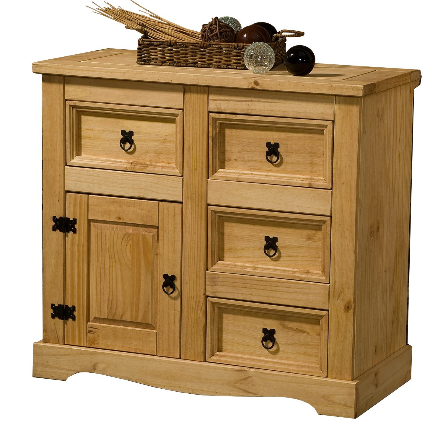 materiál masív borovica voskovaná v medovom odtieni 5 malých zásuviek, 1 dvierka, kovové ozdobné úchytky súčasť zostavy Corona