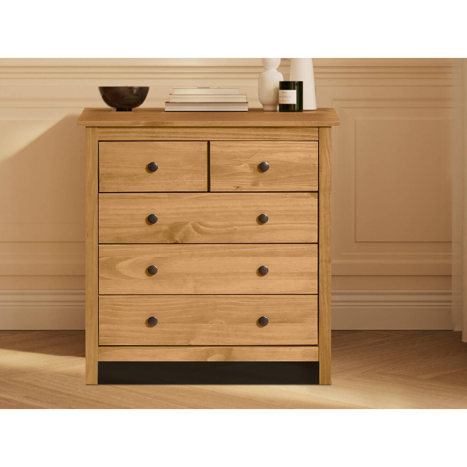 materiál masív borovica voskovaná v medovom odtieni kovové úchytky vo farebnom prevedení černená mosadz päť zásuviek s kovovými pojazdmi