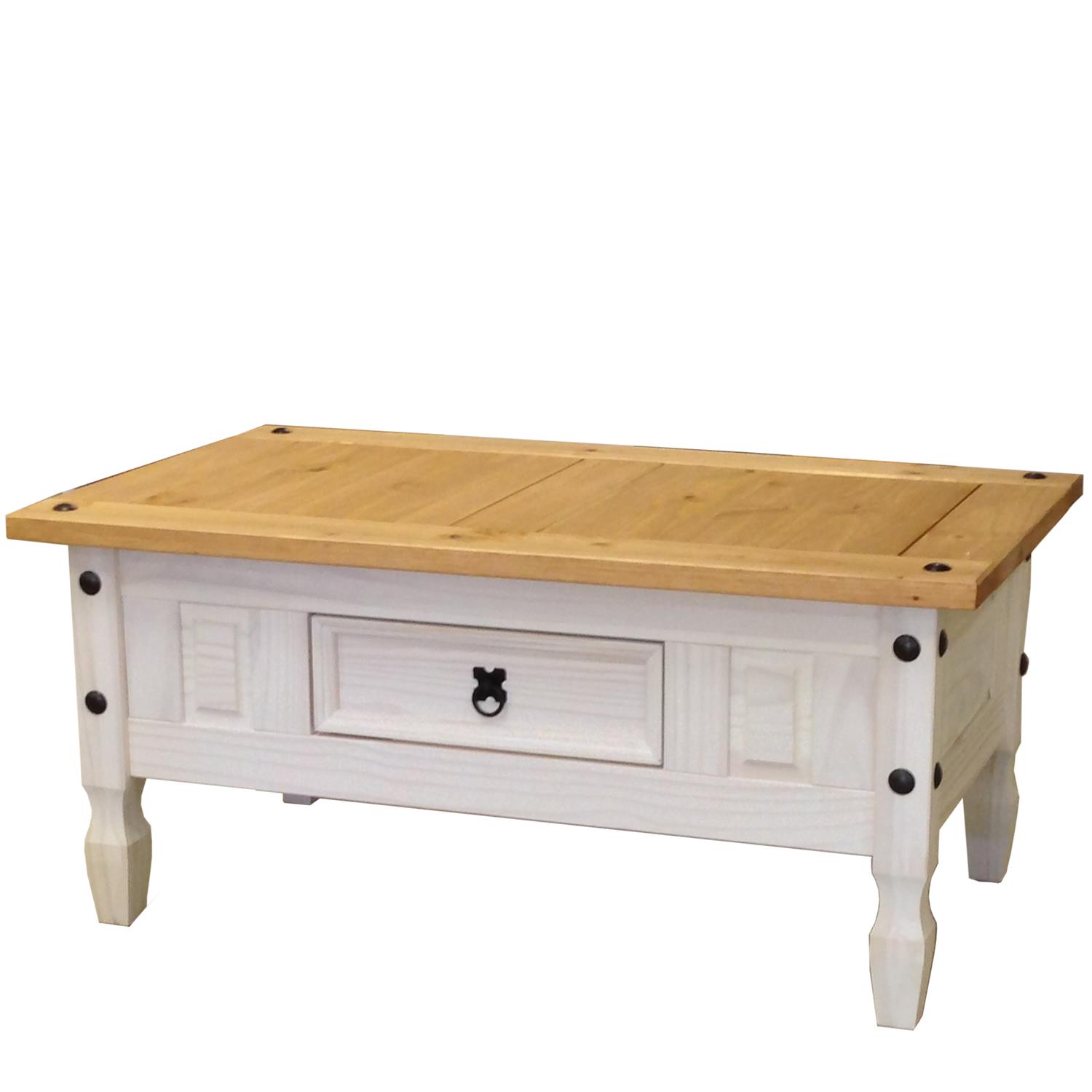 materiál masív borovica voskovaná v bielom odtieni horná doska masív borovica voskovaná v medovom odtieni 2 malé zásuvky, 1 polica, kovové ozdobné úch...