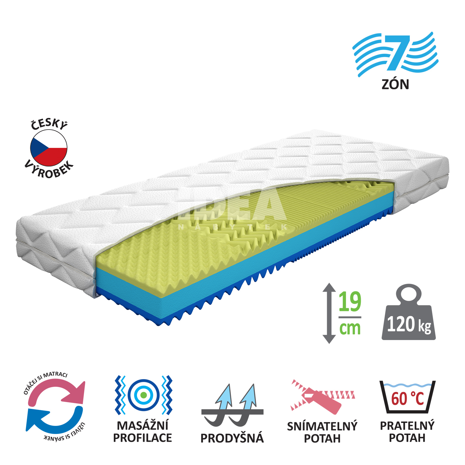 ortopedická sendvičová matrace z pěn Flexifoam s rozdílnou tuhostí stran anatomická zónová masážní profilace – 7 zón pro uvolnění a relaxaci celého tě...
