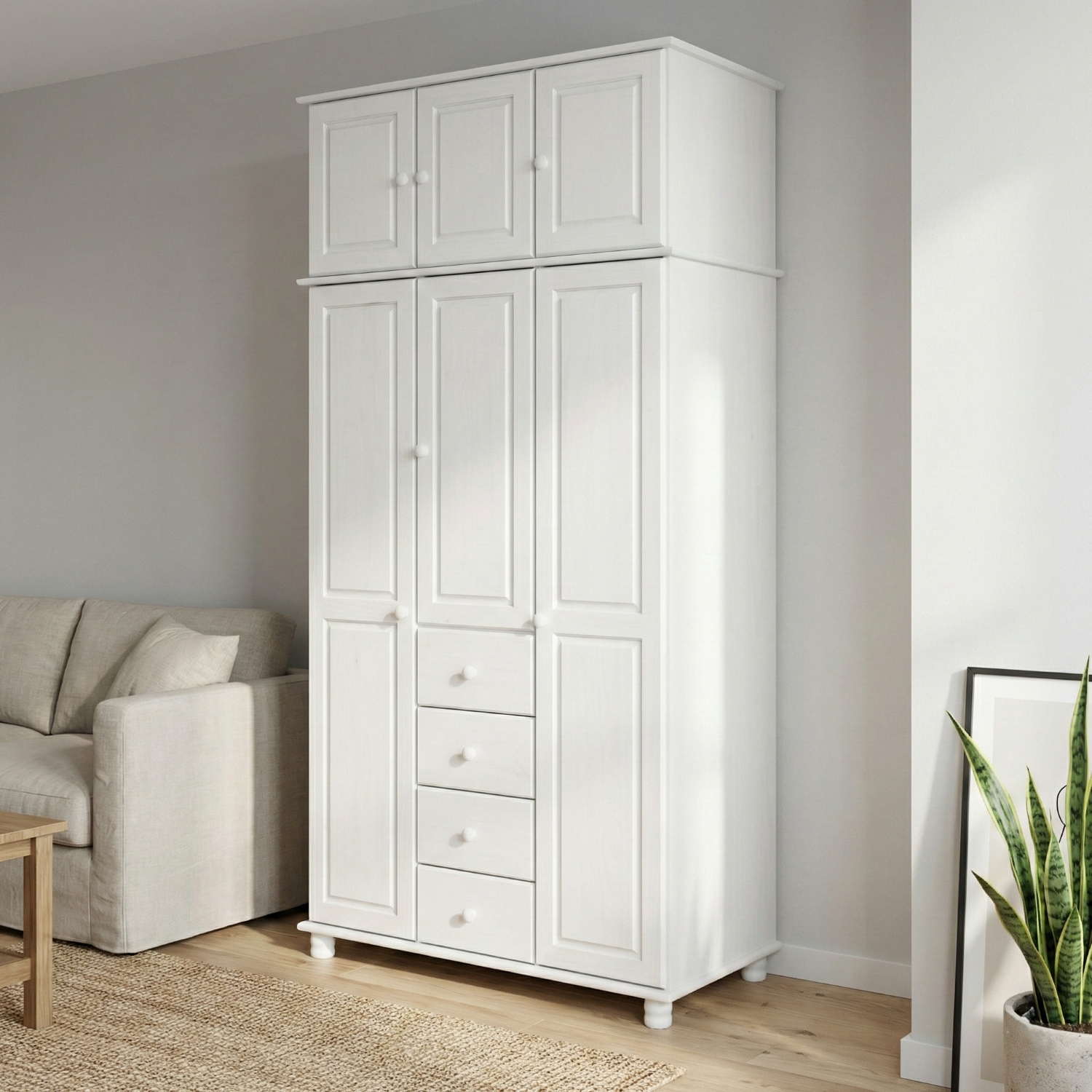 materiál masív borovica, farebné prevedenie biely lak štyri široké zásuvky s kovovými pojazdmi v ľavej časti dve šatníkové tyče, v strednej časti 1 po...