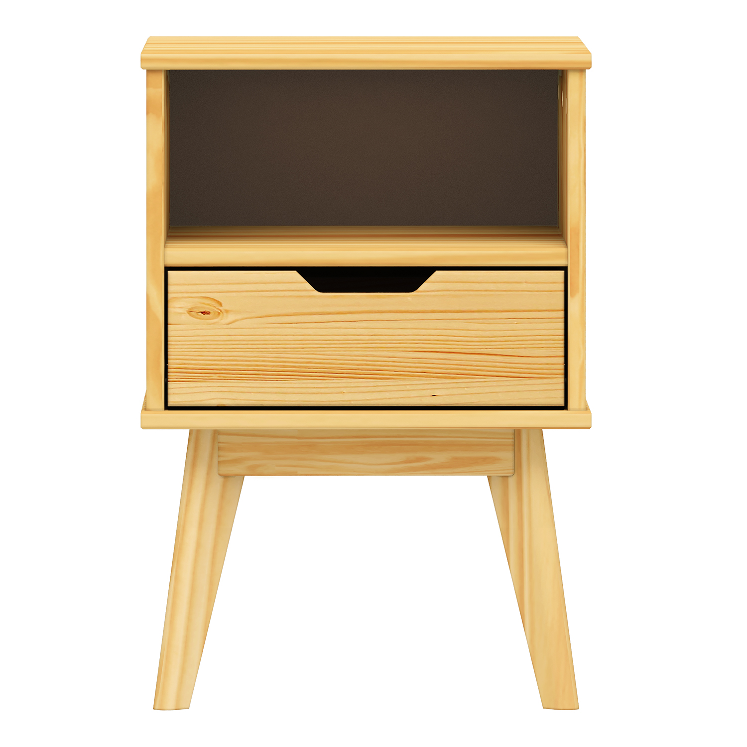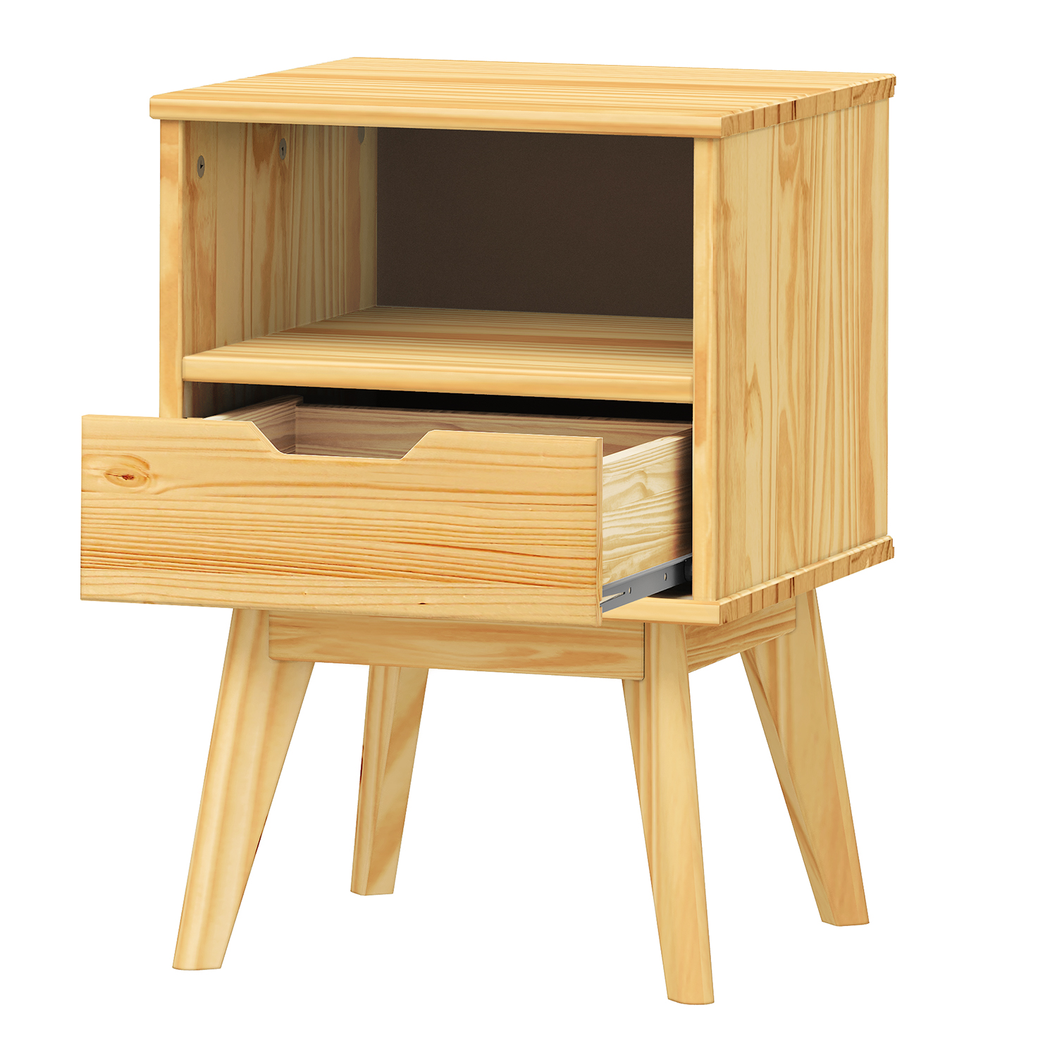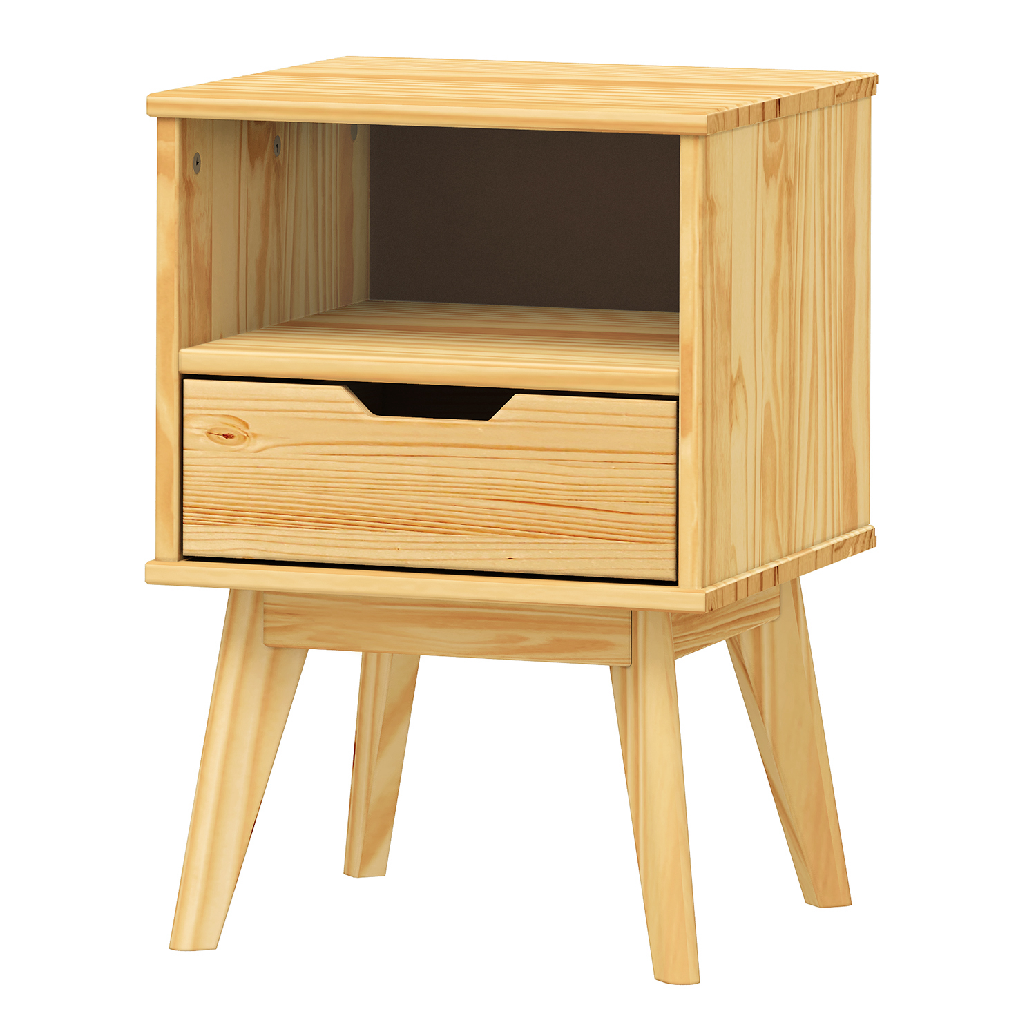materiál masív borovica, lakované prevedenie 2 zásuvky s kovovými pojazdmi, 1 dvierka, 1 polica otvor na pretiahnutie káblov