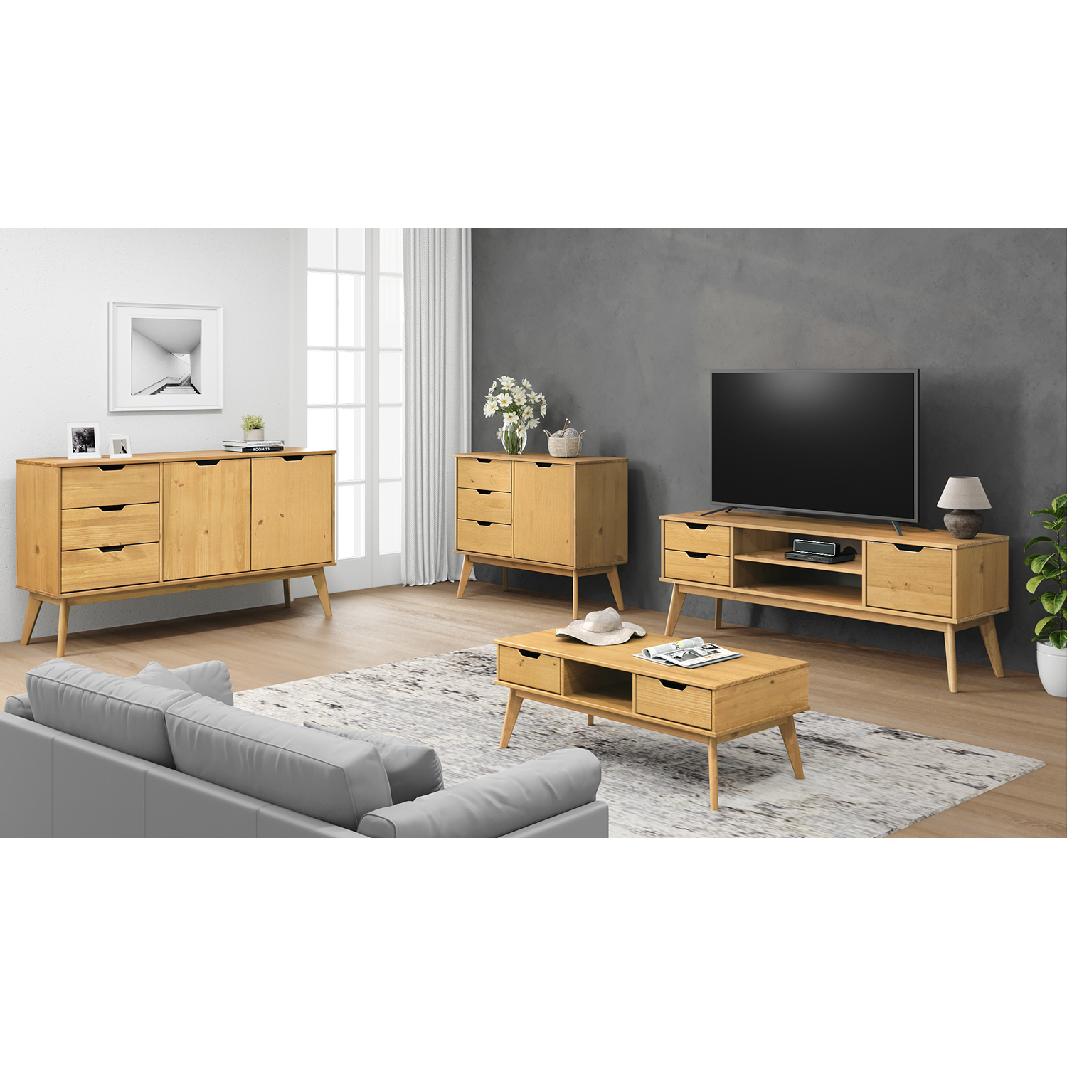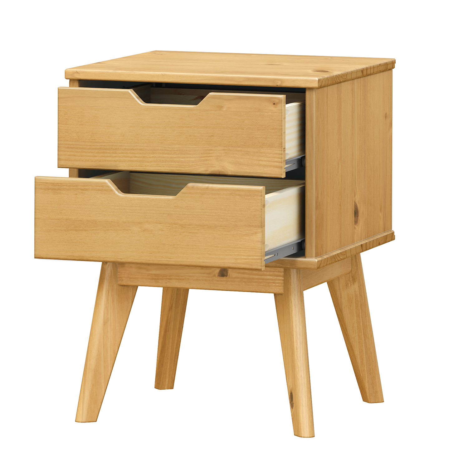 materiál masív borovica, lakované prevedenie 2 zásuvky s kovovými pojazdmi, 1 dvierka, 1 polica otvor na pretiahnutie káblov