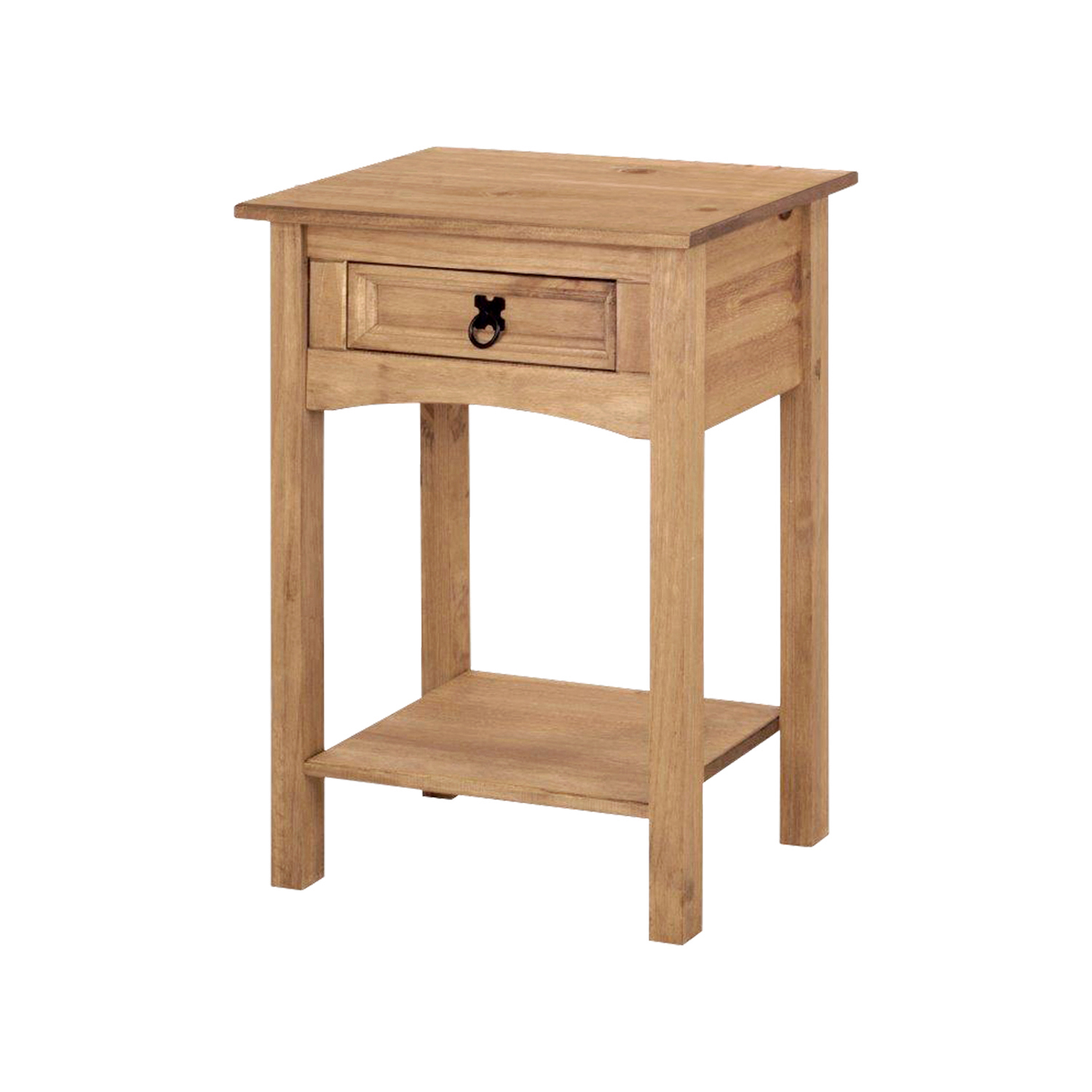 materiál masív borovica voskovaná v medovom odtieni 2 zásuvky, 1 otvorená polica, kovové ozdobné úchytky súčasť zostavy Corona 3