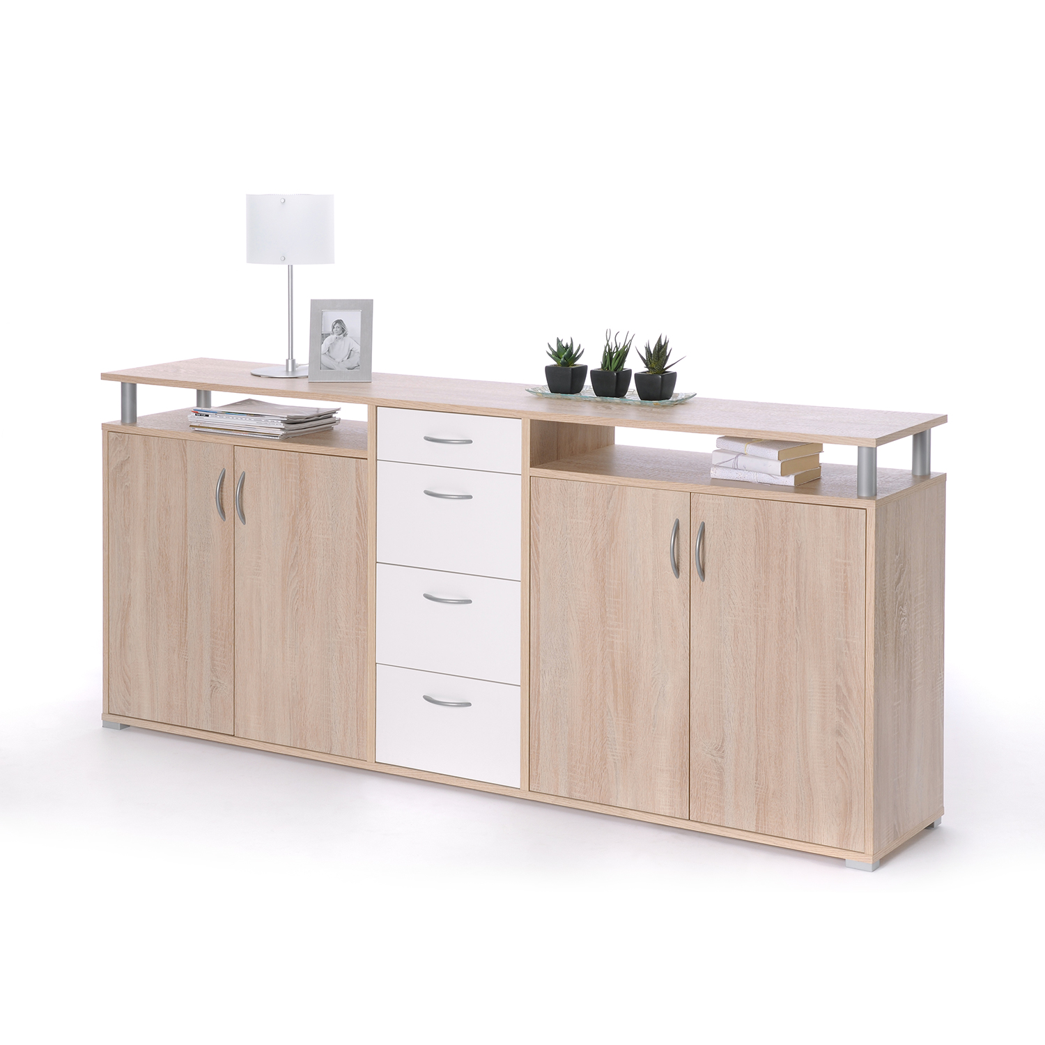 barevné provedení dub Sonoma / bílá 2 zásuvky s kovovými pojezdy 4 dvířka, 4 variabilní police