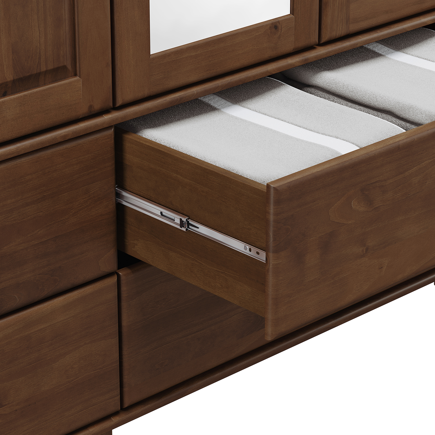 materiál masív borovica, farebné prevedenie tmavo hnedá v dolnej časti 2 dvere, 2 zásuvky s kovovými pojazdmi v hornej časti dvoje presklené dvere