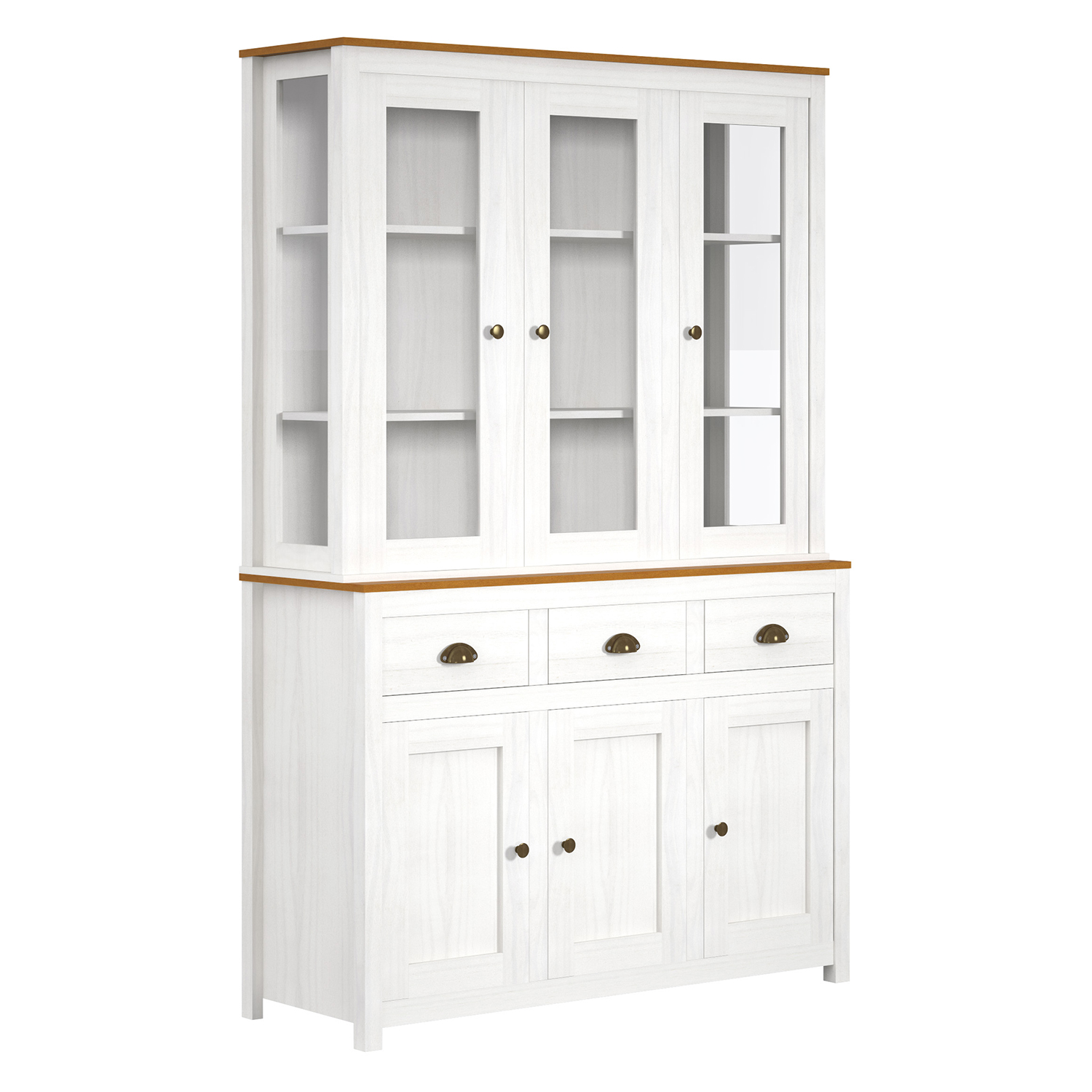 materiál masív borovica, farebné prevedenie biely / hnedý lak tri dvojradové výklopy s kovovými úchytkami