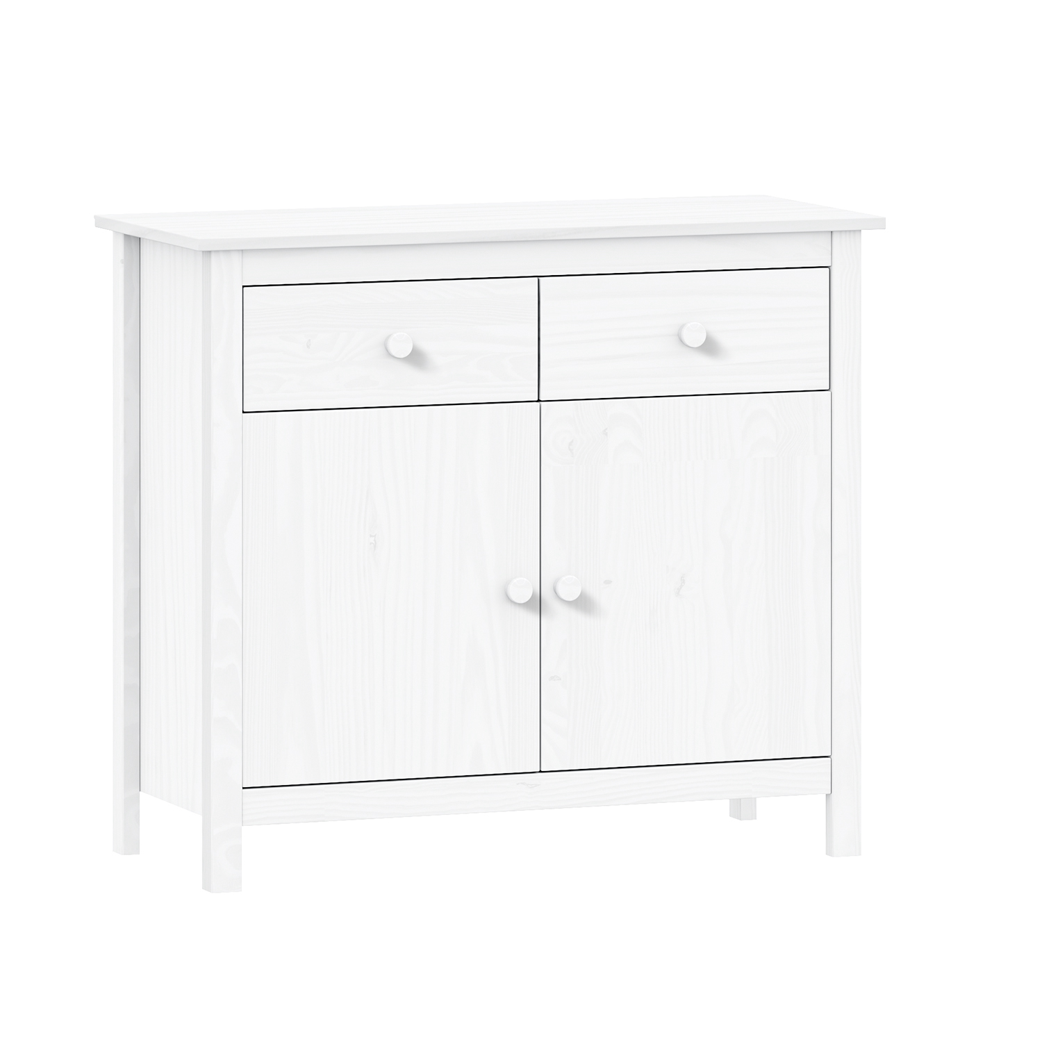 materiál masív borovica, farebné prevedenie biely lak 4 zásuvky s kovovými pojazdmi, 2 plné dvere, 1 polica