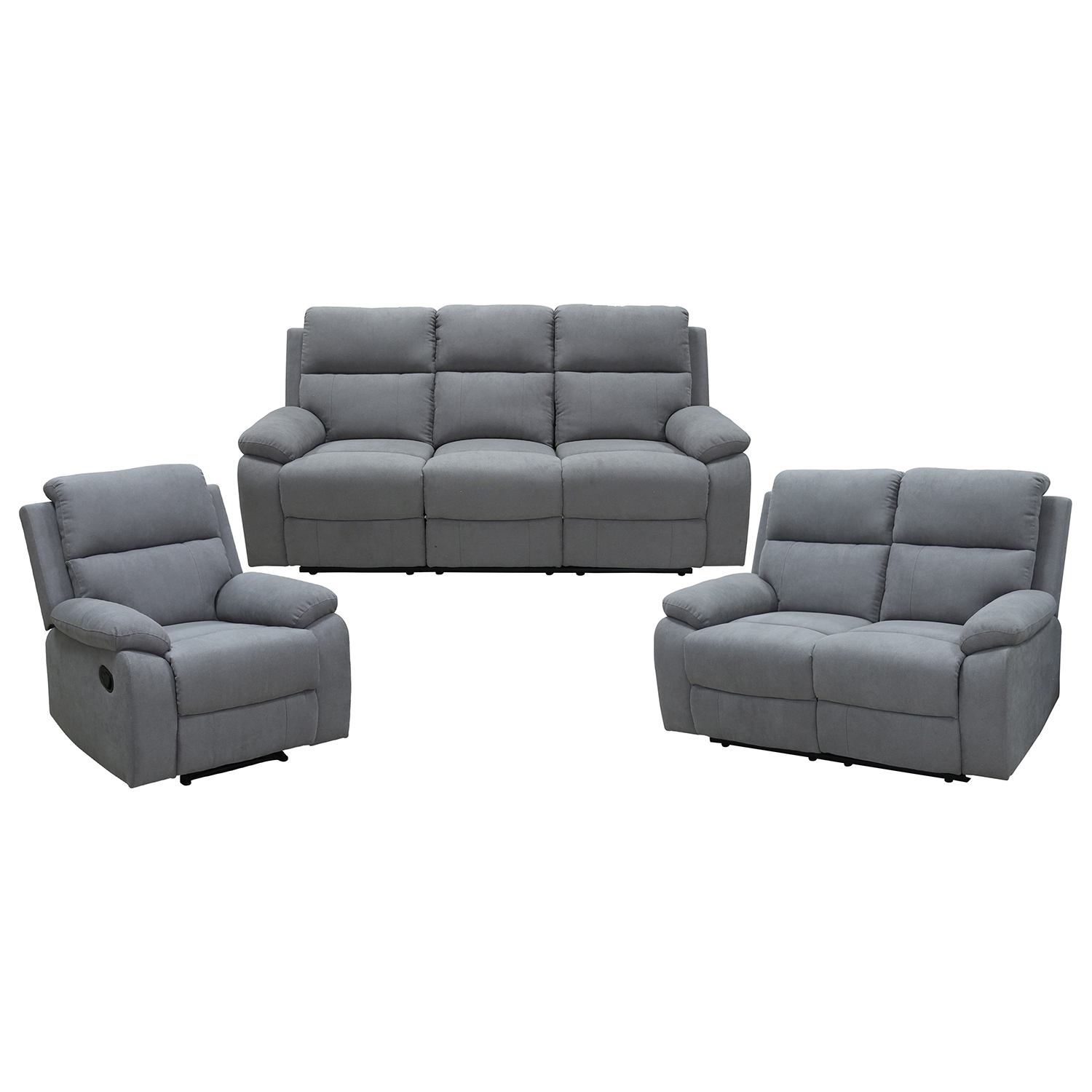 textilný poťah, farebné prevedenie svetlo sivá oba krajné sedáky sú polohovacie, stredný je pevný