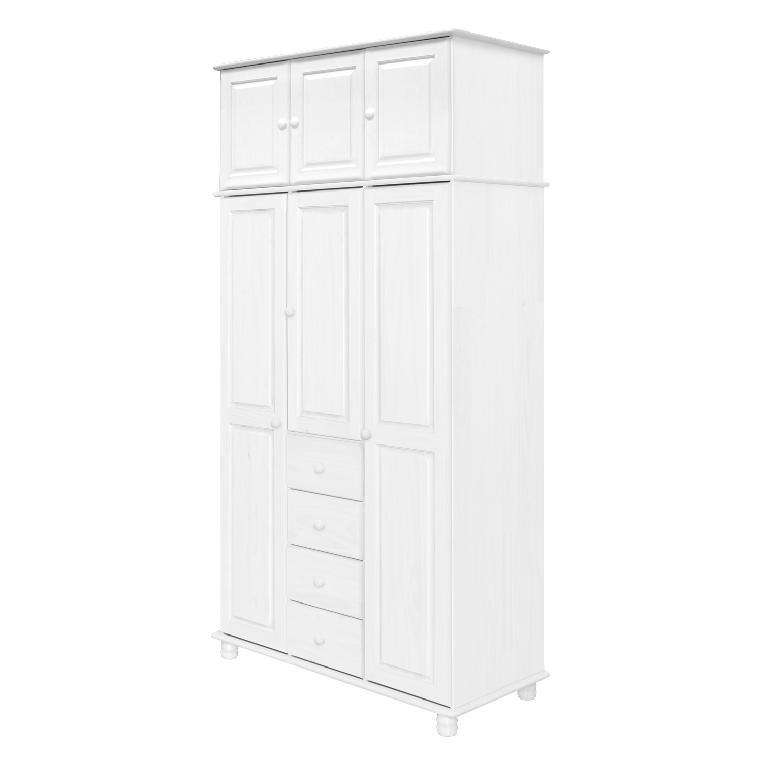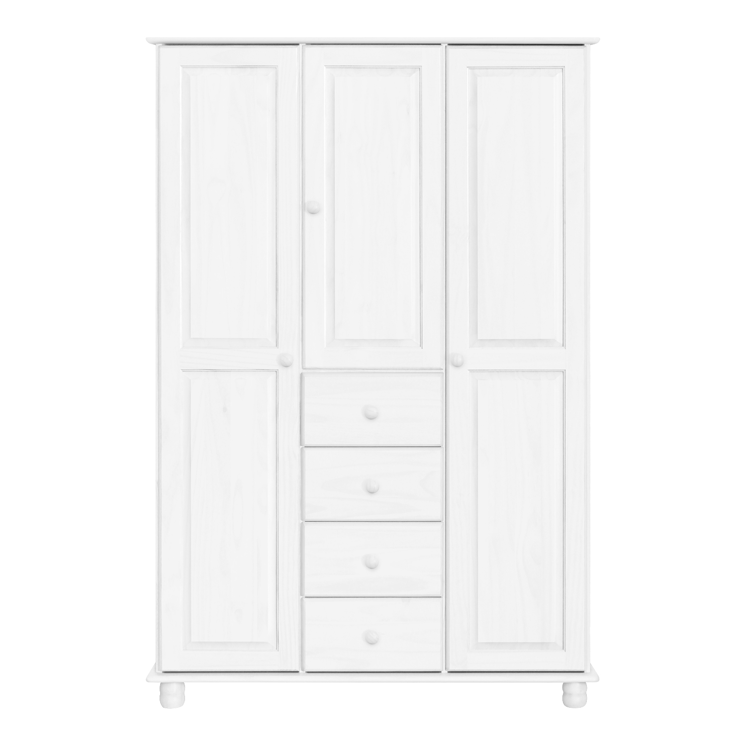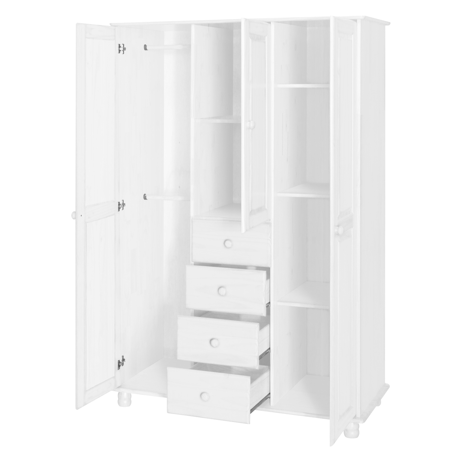 materiál masív borovica, farebné prevedenie biely lak štyri široké zásuvky s kovovými pojazdmi v ľavej časti dve šatníkové tyče, v strednej časti 1 po...