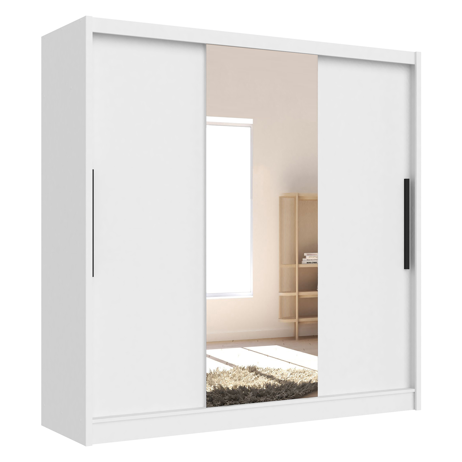 farebné prevedenie biela 3 posuvné dvere, 3 úzka zrkadla s hrúbkou 3 mm, plastové úchytky priestor delený v pomere 1:2 v ľavej užšej časti 4 police so...
