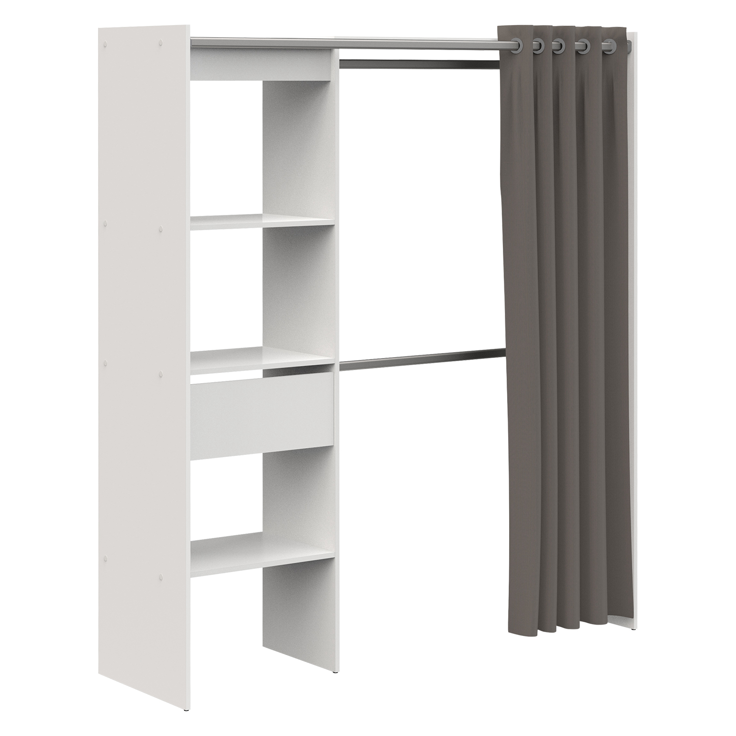 farebné prevedenie matná biela, záves materiál 100% bavlna šatníková skriňa, zostaviteľná v šírke 114 až 168 cm lišta na záves s dĺžkou 165 cm, 3 police s rozmerom (š/h) 57 × 40 cm 1 zásuvka s kovovými pojazdmi, vnútorný rozmer zásuvky (š/h/v) 51,7 × 31,2 × 10,7 cm 2 kovové šatníkové tyče s dĺžkou 108 cm rozmer závesu 203 × 190 cm, 12 otvorov na zavesenie maximálne nosnosti uvedené v návode na montáž