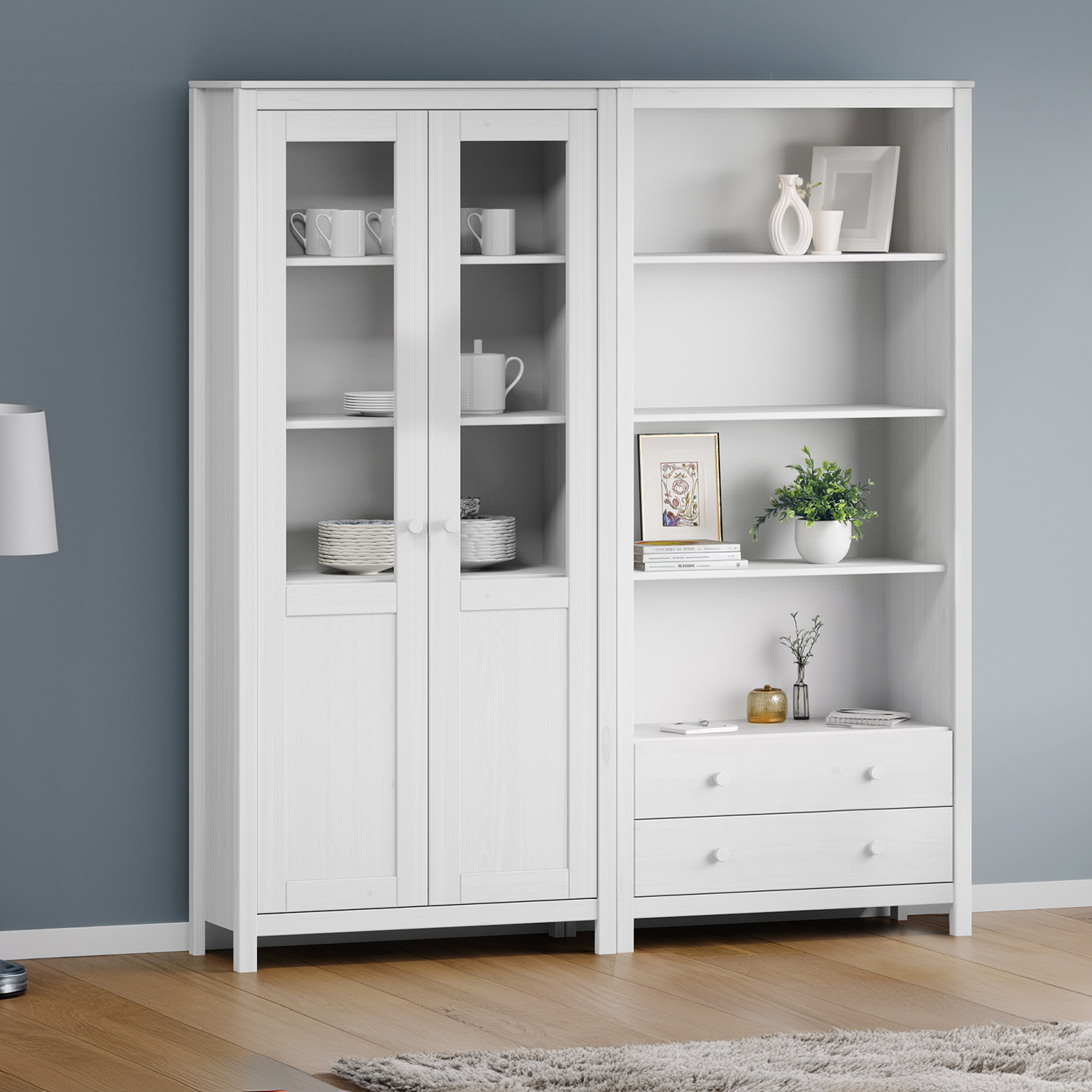 zostava knižníc TORINO 8070B a 8071B a vitríny TORINO 8072B materiál masív borovica, farebné prevedenie biely lak knižnica 8070B: štyri police knižnic...