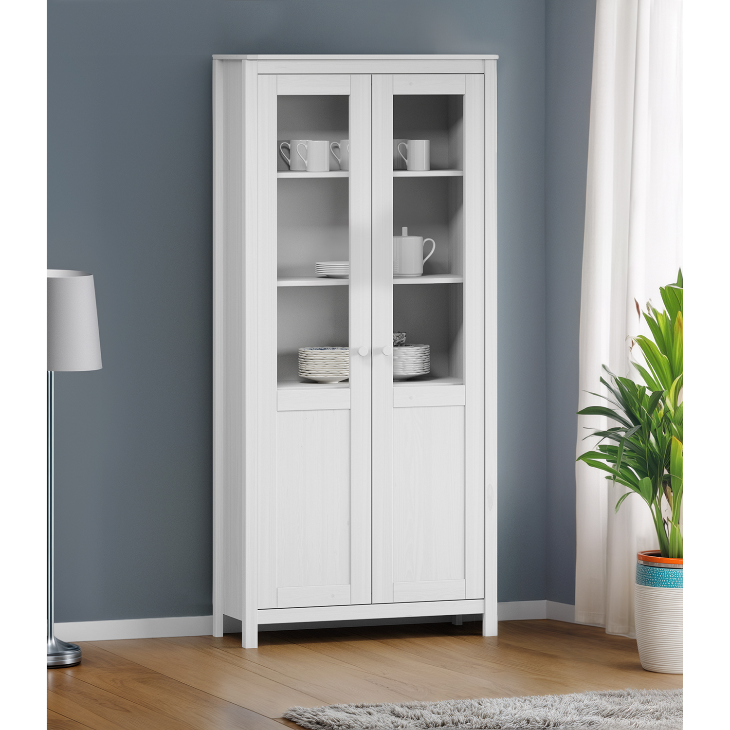 materiál masív borovica, farebné prevedenie biely lak 2 presklené dvere, 1 polica nadstavec príborníka 8095B