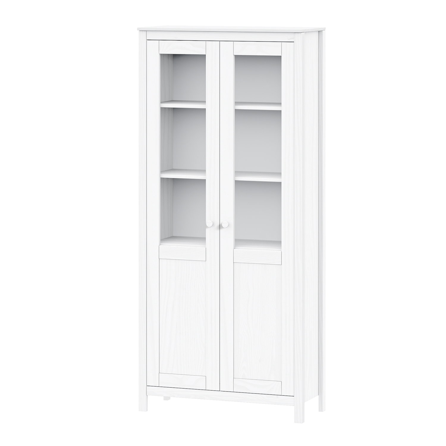 materiál masív borovica, farebné prevedenie biely lak dvoje čiastočne presklené dvere, tri police jedna zásuvka s kovovými pojazdmi
